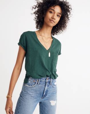 Whether you are an everyday t-shirt wearer, or a far and few between t-shirter, no one can deny the feeling of putting on a soft, light, cotton tee. If you fall in the latter category of far and few, sometimes you need a break from the frills or starched dress shirt. For me, if I don't have anything planned after work or am not attending a yoga class, I go home and one of the first things I do (after washing my hands - train life) is to change out of my work clothes and don the t-shirt and comfy pants (leggings, sweats, pajama pants). T-shirts are life. Finding an amazing t-shirt is THE BEST. My go-to tee for the past few years has been the Madewell Whisper Cotton V-Neck Pocket Tee: